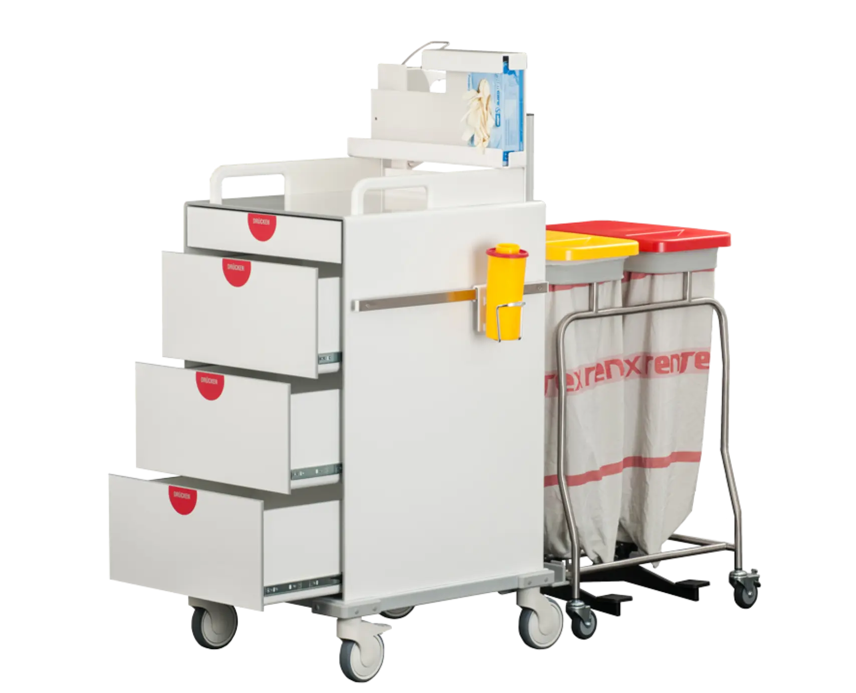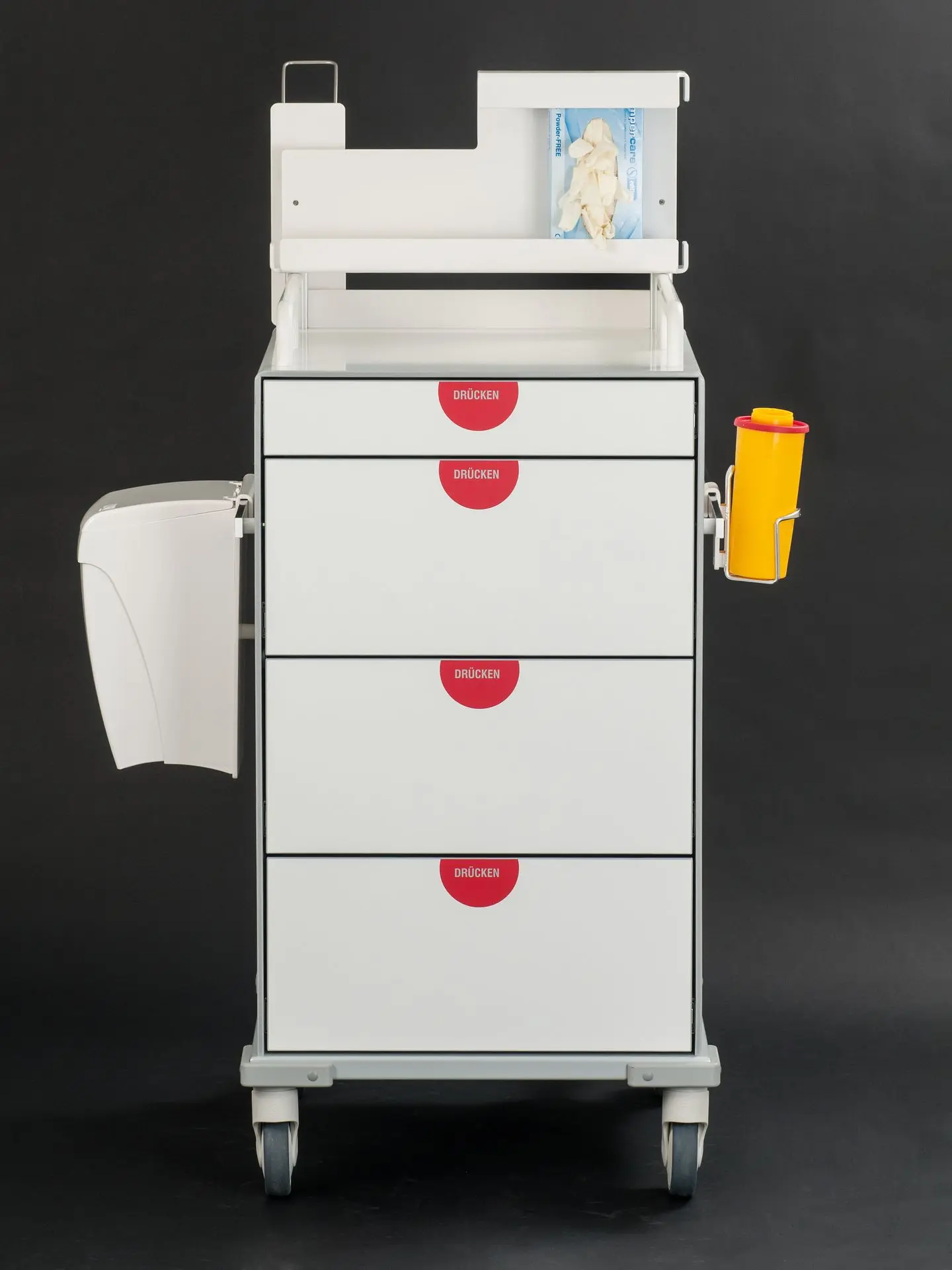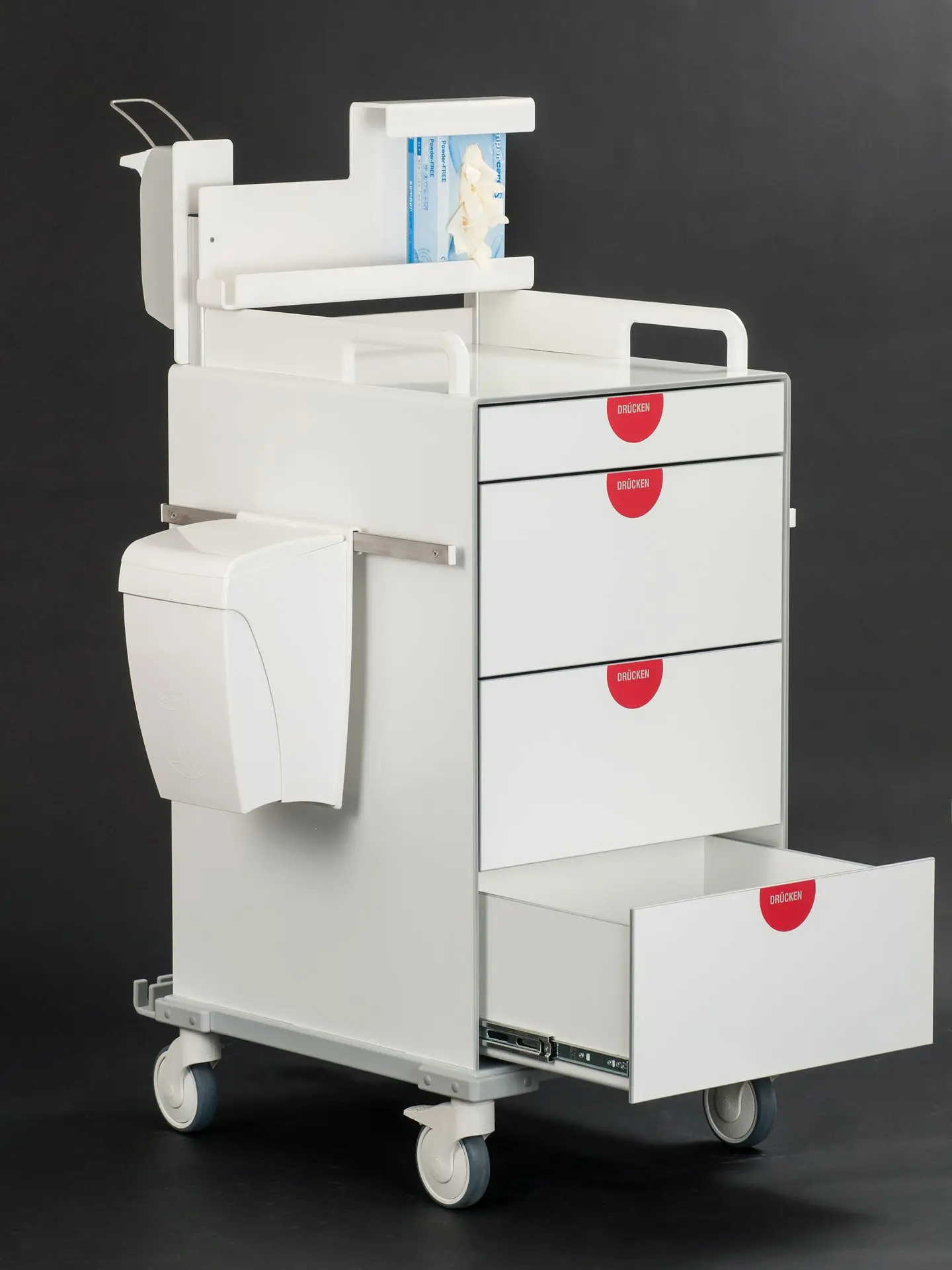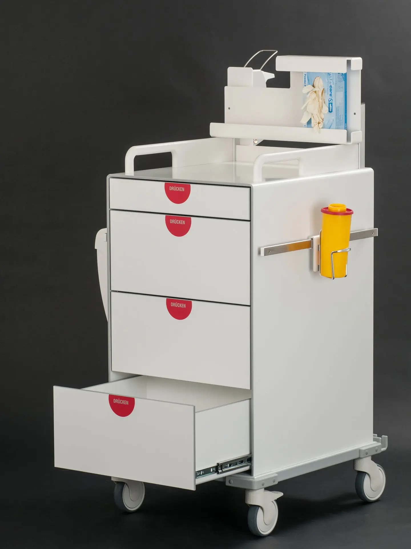 Die Laden lassen sich individuell für Medikamente und Utensilien konfigurieren – wahlweise mit flexiblen oder starren Teilern für optimale Übersicht.