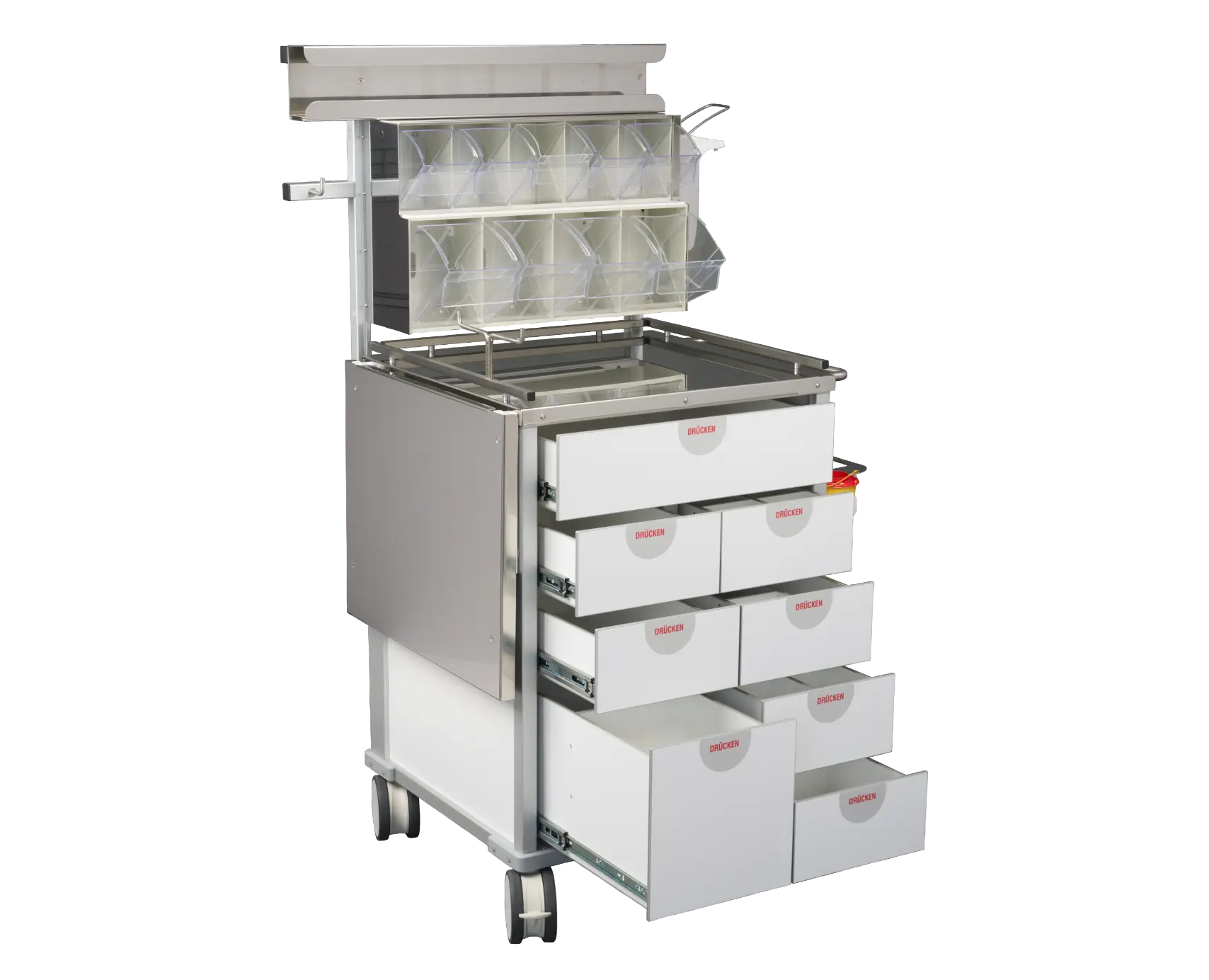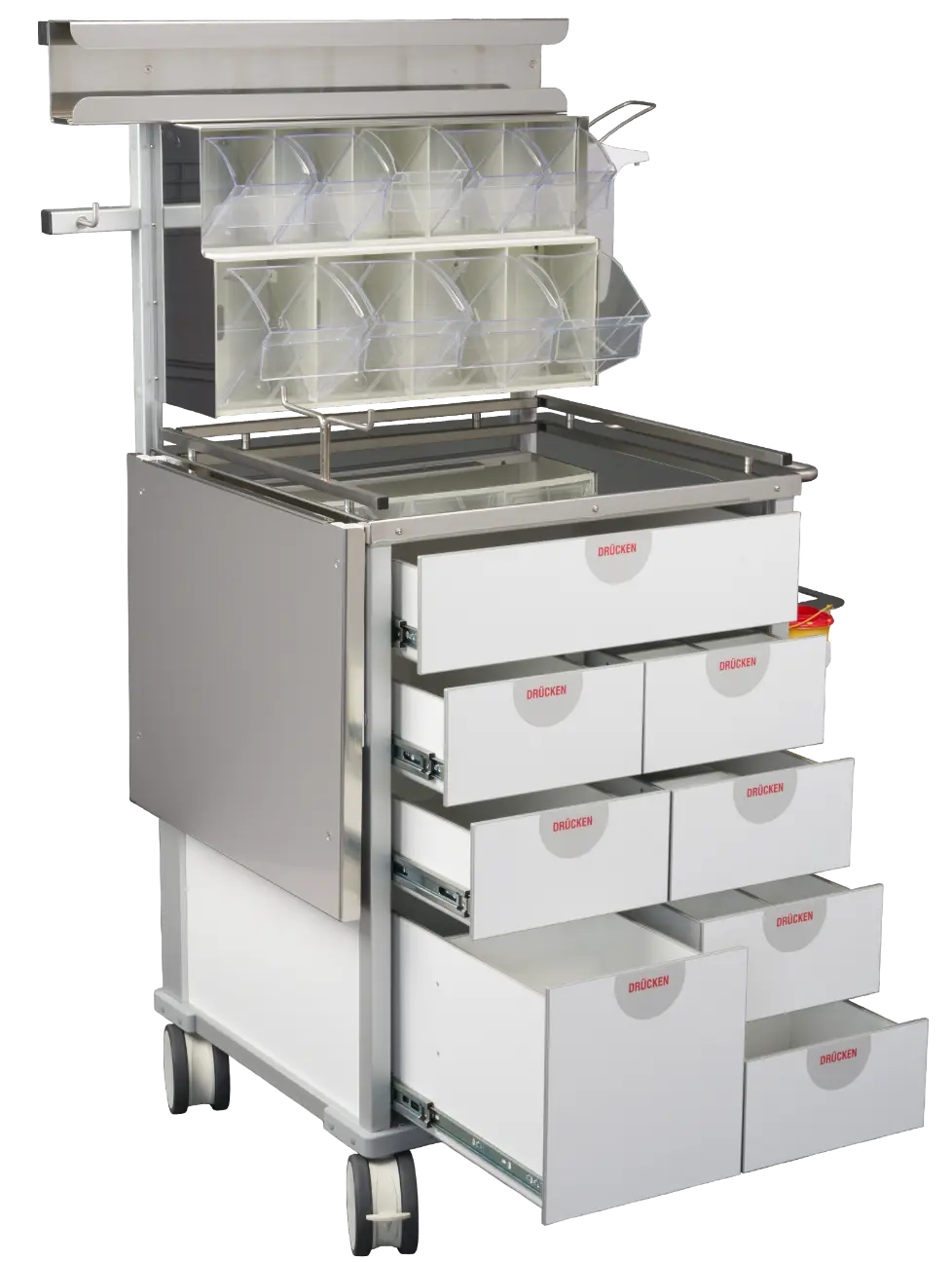 Die Laden lassen sich individuell für Medikamente und Utensilien konfigurieren – wahlweise mit flexiblen oder starren Teilern für optimale Übersicht.