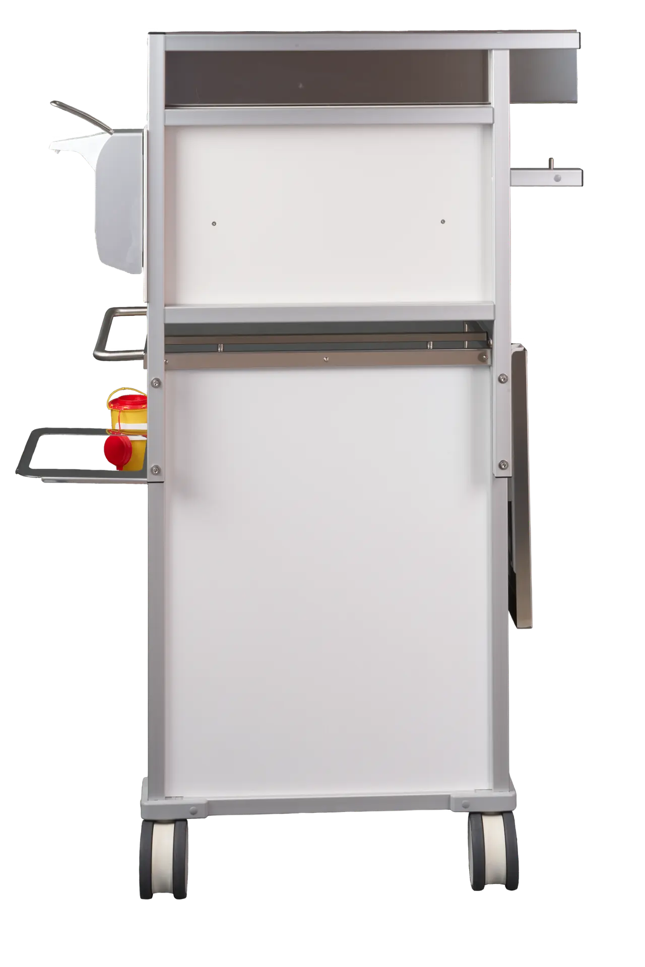 Der Viwa Spritzenwagen kann mit zahlreichen Erweiterungen ausgestattet werden, unter anderem: Klapptisch, Handschuhspender und Desinfektionsmittelspender
