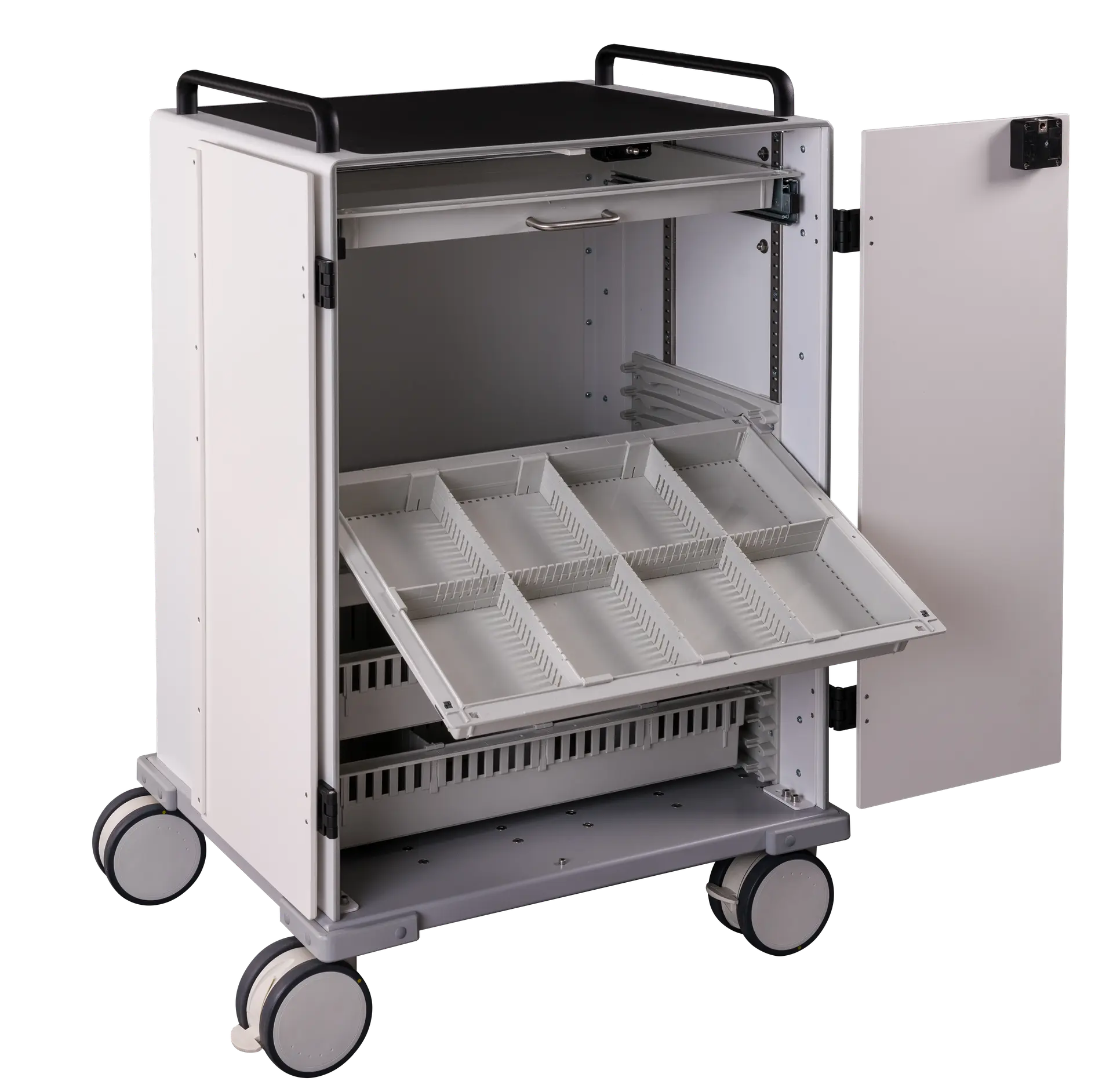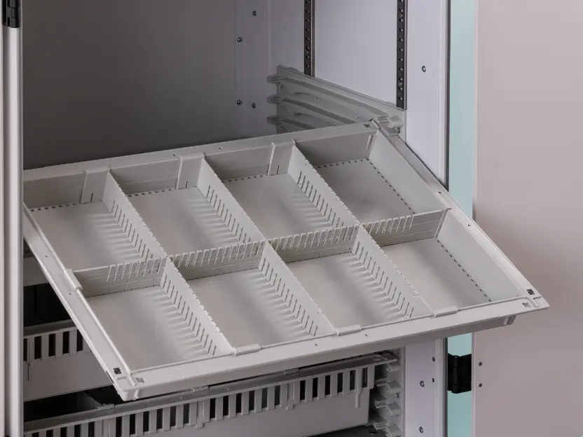 Die Laden lassen sich individuell für Medikamente und Utensilien konfigurieren – wahlweise mit flexiblen oder starren Teilern für optimale Übersicht.